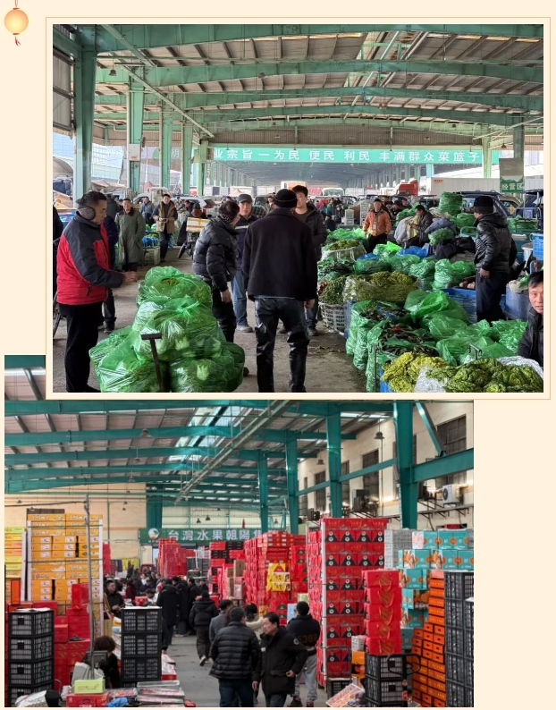 隨著春節臨近,大街小巷新年的氣息越發濃厚。朝陽農產品大市場已開啟“春節模式”,迎來了交易最高峰,1月16日-1月22日,水果市場日均交易量4309噸,同比去年春節前同期上升7.94%,1月20日單日交易量達到4713噸,均價4.6元/斤,同比下降6.7%;蔬菜市場日均交易量達2240噸,同比去年春節前同期上升4.13%,均價1.5元/斤,同比下降13.8%。