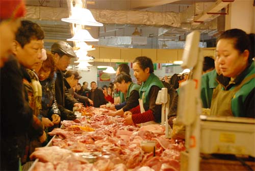 早上7點開始,一直到下午18點,槐古支路上,市場門口早已排滿各種非機動車輛,市場一樓的蔬菜區用寸步難行來形容并不過分,各個攤位前擠滿了買菜的人群。無錫市民過節必備的如意菜--黃豆芽攤位前,以及肉類加工區、家禽屠宰區更是排起了長龍。這也是朝陽農貿市場新樓開業后所出來沒有過的熱鬧。