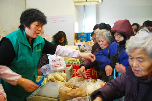 市場內人頭攢動,人們紛紛帶著老婆開著車、吃著火鍋唱著歌來到朝陽農貿市場,擠進去一看,額滴神那--攤主們應接不暇、名特商品供不應求,這不,阿三又在大聲吆喝:“實在抱歉,老豆腐賣完咧,后頭咯覅排隊咧!”