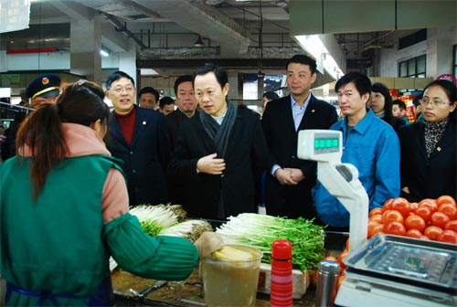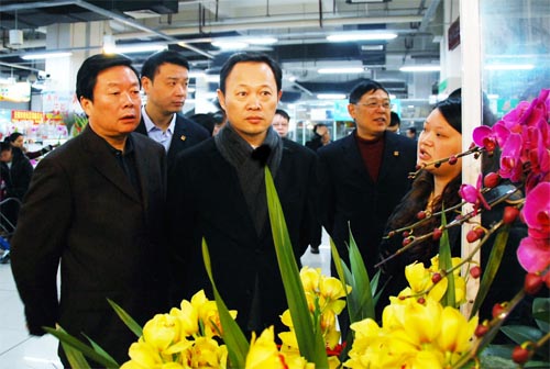 1月31日上午,無錫市第十三屆政協主席周敏煒、副主席王錫南、秘書長顧韜、經科委主任周衛國、副主任任國偉等一行來到無錫朝陽集團,視察春節市場供應工作。朝陽集團董事長張海良、總經理楊興德、常務副總經理張君君、市政協委員、天惠超市董事長張慶卿、天惠超市總經理羅志堅陪同政協領導分別實地查看了天惠超市朝陽店、朝陽農貿市場和無錫文化工藝品市場花卉區。