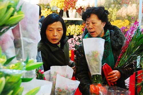 情人節來啦!今天一大早,位于南禪寺槐古路6號的無錫文化工藝品市場花卉區已是熙熙攘攘,人頭攢動。走進市場大門,滿眼盡是各色花卉爭相斗艷,撲鼻而來的淡淡花香更是沁人心脾。在幾個鮮花攤位前,早已圍滿了挑選鮮花的顧客。玫瑰是情人節當仁不讓的“寵兒”,短短一個上午,市場里的玫瑰花已經告急,單支的價格也賣到了近10元一支。而一束束已包裝好的玫瑰花束更是奪人眼球,“藍色妖姬”、“水晶之戀”的名字聽著就讓人動心,當然價格也不菲,19支包裝一束的“水晶之戀”已賣到了300元。除了玫瑰花,高貴的百合、浪漫的紫羅蘭、神秘的郁金香、清新的馬蹄蓮、快樂的“天堂鳥”、活潑的雛菊,筆直的劍蘭更是許多顧客爭相挑選的熱銷鮮花品種。