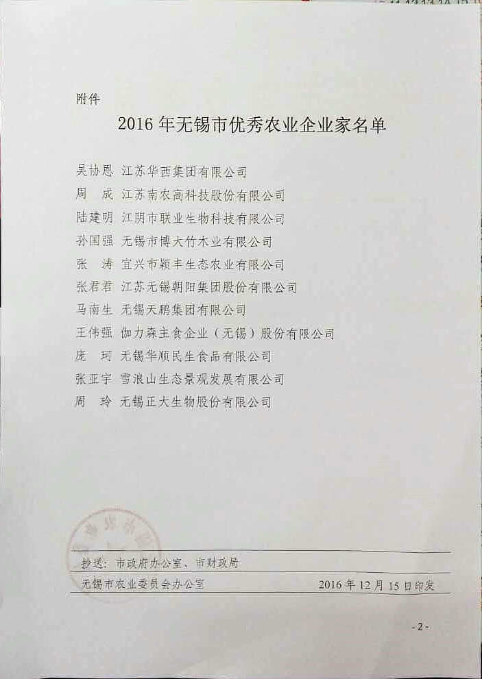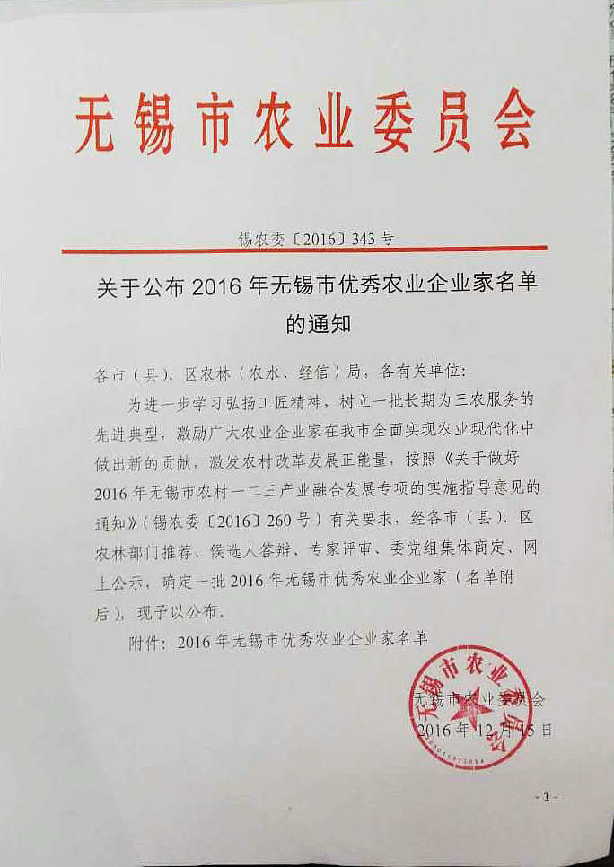 根據無錫市農業(yè)委員會錫農委[2016]343號文件精神,無錫朝陽集團董事長張君君被評為“2016年無錫市優(yōu)秀農業(yè)企業(yè)家”。
