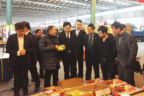 參訪團一行首先參觀了三中心,了解了朝陽農產品大市場的整體發展情況。隨后他們又來到臺灣水果朝陽集散中心,詳細了解了集散中心所經營的“綠莊園”品牌臺灣水果的種類、銷售情況,以及無錫市民對臺灣水果的評價與消費習慣等。候市長希望通過此次考察,加強與無錫市場的進一步溝通和交流。
