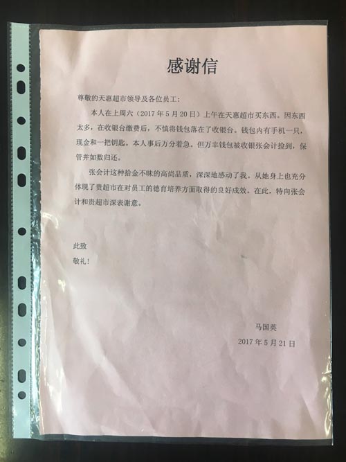 張會計這種拾金不昧的高尚品質,深深地感動了我。從她身上也充分體現了貴超市在對員工的德育培養方面取得的良好成效。在此,特向張會計和貴超市深表謝意。