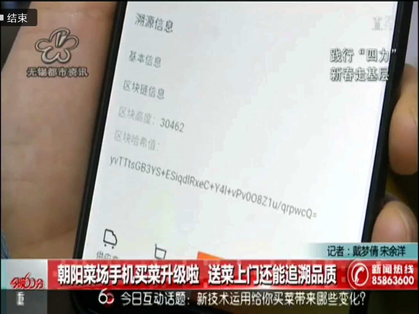 2月12日晚,無錫電視臺都市資訊頻道《今晚60分》欄目播放了“朝陽菜場手機買菜升級啦 送菜上門還能追溯品質”的新聞,介紹朝陽到家APP的便民服務優勢和區塊鏈技術優勢。(鴻雁)