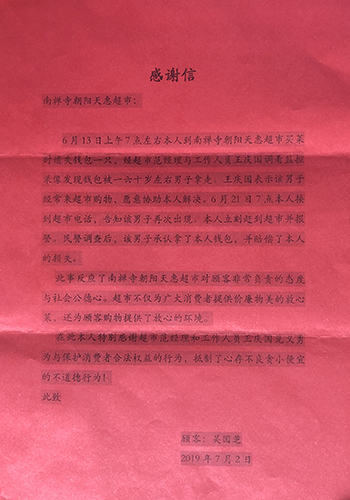 | 南禪寺朝陽天惠超市: 6月13日上午7點左右本人到南禪寺朝陽天惠超市買菜時遺失錢包一只,經超市范經理與工作人員王慶國調看監控錄像發現錢包被一六十歲左右男子拿走。王慶國表示該男子經常來超市購物,愿意協助本人解決。6月21日7點本人接到超市電話,告知該男子再次出現。本人立刻趕到超市并報警。民警調查后,該男子承認拿了本人錢包,并賠償了本人的損失。 此事反應了南禪寺朝陽天惠超市對顧客非常負責的態度與社會公德心。超市不僅為廣大消費者提供價廉物美的放心菜,還為顧客購物提供了放心的環境。 在此本人特別感謝超市范經理和工作人員王慶國見義勇為與保護消費者合法權益的行為,抵制了心存不良貪小便宜的不道德行為! 此致