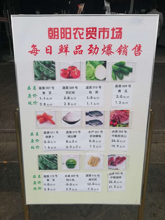 朝陽農貿市場在后疫情時代,響應各方政府“拉動消費”的號召,率先在4月初就推出了“每日鮮品讓利銷售”活動,市場積極動員全場經營戶輪流“一日零利潤銷售”活動,讓利于民。從最早的4個商品逐步增加到12個商品,商品品類不斷拓展:蔬菜、肉類、禽蛋、水產、水果、副食品。