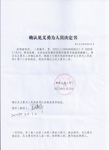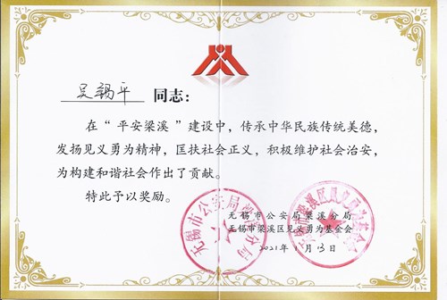 近日,無錫朝陽股份有限公司蔬菜保衛科科長吳錫平收到來自無錫市公安局梁溪分局的《確認見義勇為人員決定書》和獎勵證書。