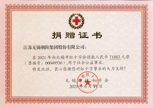 | 為大力弘揚“人道、博愛、奉獻”的紅十字精神,進一步培育和踐行社會主義核心價值觀,傳遞溫暖,傳承大愛。市委宣傳部、市文明辦、市委市級機關工委和市紅十字會聯(lián)合開展以“匯聚人道力量,建設幸福無錫”為主題的“紅十字人道萬人捐”活動。朝陽集團廣大干部職工在集團創(chuàng)始人、董事長、總經理室的帶頭下,踴躍參與,慷慨解囊,共募集捐款資金71883元,以實際行動和無私奉獻抒寫朝陽大愛。無錫市紅十字會向我單位頒發(fā)了捐贈證書,對我單位情系社會公益事業(yè)的善行義舉和人道主義精神表示謝意。