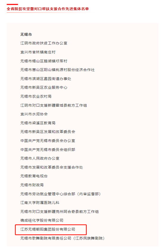 江蘇無錫朝陽集團榮獲“全省脫貧攻堅暨對口幫扶支援合作先進集體”稱號