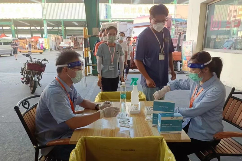 緊急動員,阻擊疫情擴散 自疫情開始以來,朝陽股份就實行“抗原檢測+核酸檢測”的防控手段,即市場人員抗原檢測一天兩檢,入場會員一天一檢。7月4日起,朝陽股份調集骨干員工,深入蔬菜市場、水果市場各個大棚,設立抗原檢測點,以便市場所有人員能在第一時間完成篩查,并如期完成當天核酸檢測。 “每個棚要設立一個點位。”“抗原檢測點位的人員如何安排?”“所有人員必須在門崗檢查抗原檢測顯色正常后才可出場。”4日凌晨三點,面對錯綜復雜的疫情走向與全新而陌生的篩查方式,領導班子、市場經理室成員迅速頭腦風暴,短短一個小時完成了點位設立、試劑分發、人員安排、通知下發等一系列工作,在最快時間內保證市場內所有人員抗原檢測“做得到、做得快、結果準”。 疫情當下,常態化防控工作不能有任何松懈,無論是烈日驕陽還是風雨交加,無論是“掃碼抗原核酸”三件套,還是“代采購代配送”暖心服務,朝陽員工總會出現在最前線。在持續進行的全員核酸及抗原檢測工作中,“朝陽力量”勇于擔當,沖鋒在前,為打造“無疫市場”攜手同心,全力以赴,共同構筑了最美的風景線!