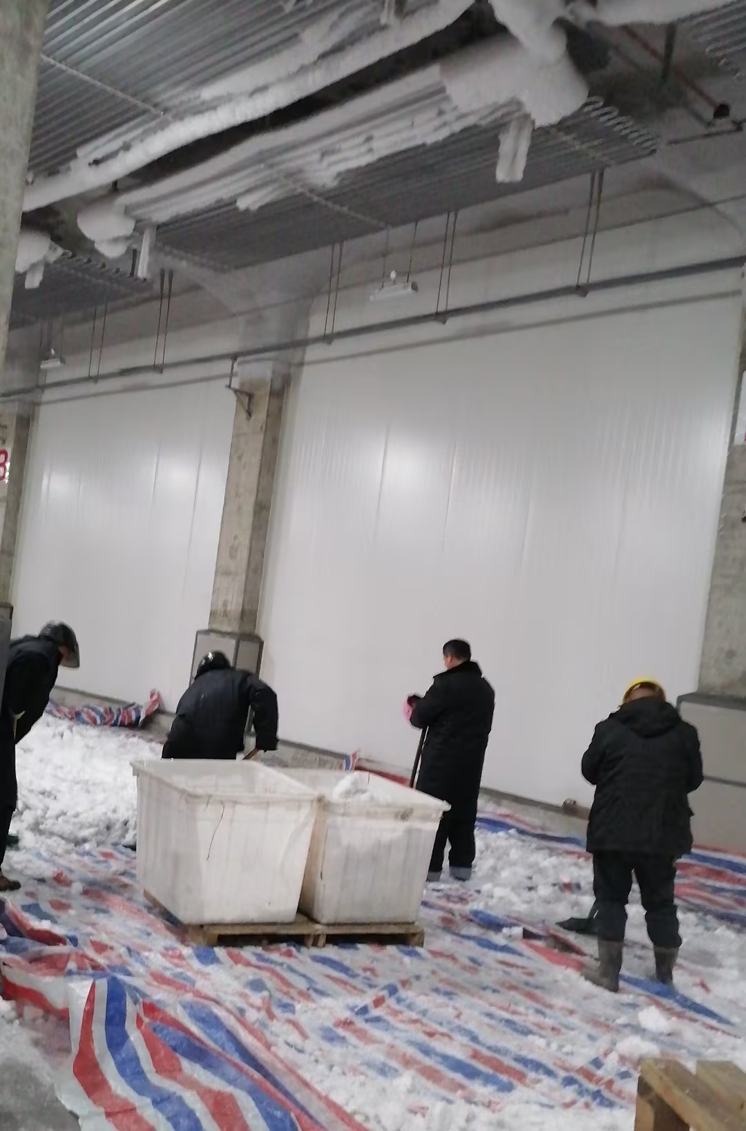朝陽冷庫(kù)是朝陽農(nóng)產(chǎn)品供應(yīng)鏈中的重要節(jié)點(diǎn),負(fù)責(zé)農(nóng)產(chǎn)品的低溫儲(chǔ)藏功能,由于商品進(jìn)出庫(kù)頻繁,冷庫(kù)庫(kù)門經(jīng)常開關(guān),導(dǎo)致蒸發(fā)排管表面結(jié)霜,影響制冷效果。為使冷庫(kù)保持穩(wěn)定低溫,確保貨物存儲(chǔ)狀態(tài),降低設(shè)備耗能,朝陽冷庫(kù)聯(lián)系廠家、組織員工、協(xié)調(diào)搬運(yùn),共同開展冷庫(kù)9、10號(hào)庫(kù)除霜工作。