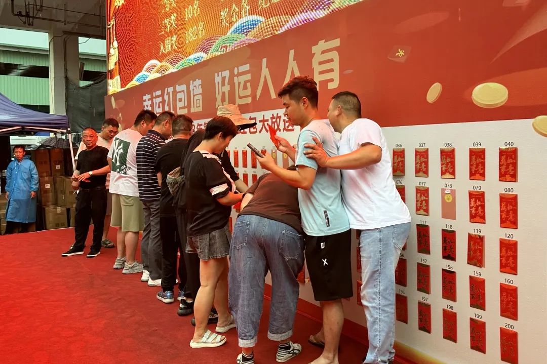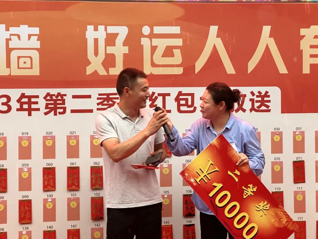 在主持人簡短的活動介紹及無錫朝陽股份總經理朱健祥熱烈激昂的致辭后,便進入了最振奮人心的抽獎環節。雖然上午活動開始時風雨交加,但廣大會員的熱情無法阻擋,在工作人員的引導下,大家競相到紅包墻上揭下紅包,并滿懷期待地打開。舞臺周圍獎品排列整齊,也吸引了大家的目光。