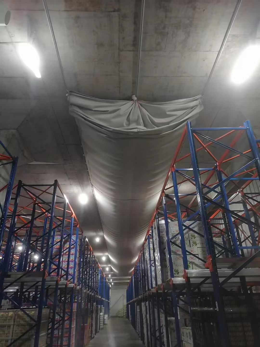 朝陽冷庫制冷系統采用布袋風管送風,布袋風管送風均勻,不增加水果、蔬菜的干耗,可以延長果蔬的儲存時間,降低損壞率;布袋風管通風系統方便拆裝,可以方便進行管道擦拭、清洗。