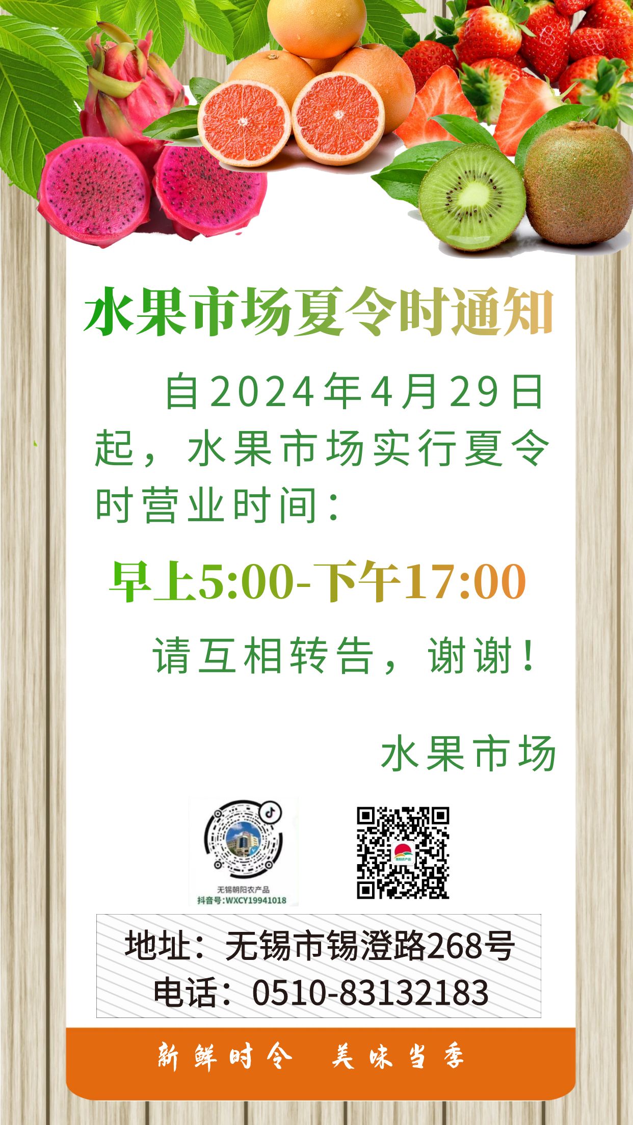 自4月29日起,朝陽股份水果市場將調整為夏令時營業時間: