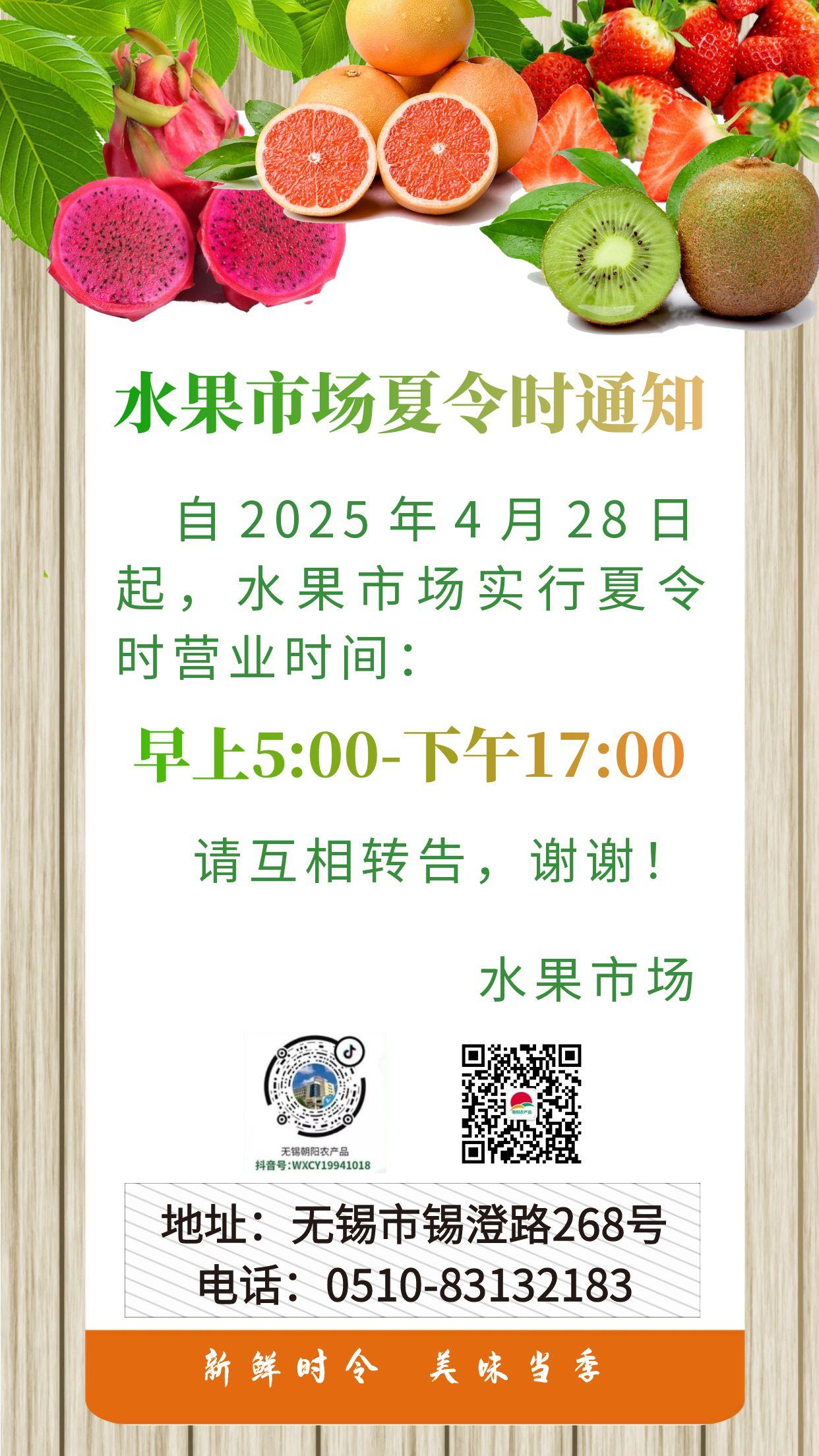 自4月28日起,朝陽股份水果市場將調整為夏令時營業時間: