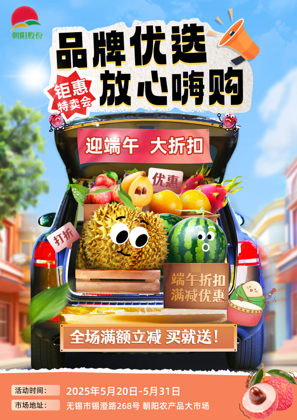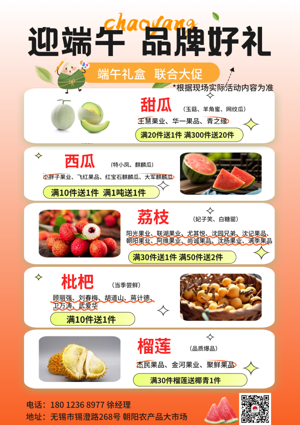 隨著端午佳節(jié)的臨近,瓜果的香味漸漸彌漫,朝陽(yáng)水果市場(chǎng)已為您備好了滿滿的端午驚喜。荔枝、枇杷、榴蓮、西瓜、甜瓜......要買節(jié)日走親訪友的禮盒饋贈(zèng),就到朝陽(yáng)水果市場(chǎng),優(yōu)惠促銷趕早來(lái)采購(gòu)!