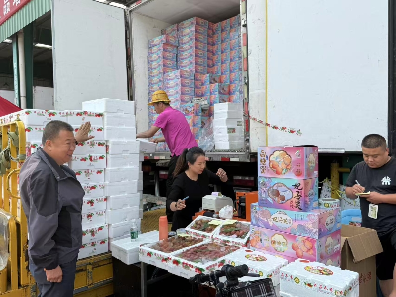 近日,朝陽水果市場端午促銷活動進行地如火如荼,水果市場中央大道兩側荔枝區也相當“鬧猛”,隨著廣東、海南等主產區荔枝大量上市,整車整柜的荔枝持續到貨,車載銷售的荔枝并車齊驅,車擠車,人擠人,爭相競品這一口初夏甜蜜。