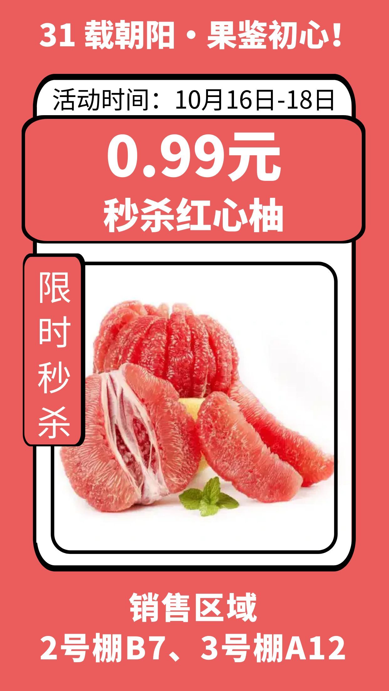 紅柚、蜜橘超低價回饋 金秋正是吃柚子、蜜橘的好時節,朝陽 31 周年慶特別推出超低價回饋,每天限量供應,手慢無!精選皮薄肉厚、果肉晶瑩、酸甜多汁的紅心柚,周年慶專屬價 0.99元/斤;果皮易剝、果肉無籽、口感清甜的蜜橘,周年慶專屬價0.9元/斤,快來囤滿全家吃個夠!這兩款鮮果均從產地直采,省去中間環節,既保證新鮮度,又把價格壓到最低,是本次周年慶不可錯過的 “必囤清單”!