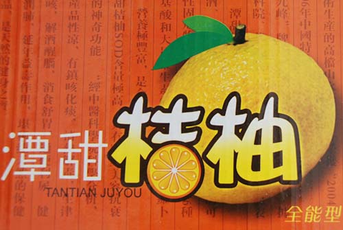 潭甜桔柚,產地福建南平市建甌市。潭甜桔柚是以八朔柚為父本,上田溫州蜜柑為母本雜交選育出的桔柚雜種。20世紀80年代初從日本引進(日本名的中文譯名為甜春桔柚),在福建省建陽市良種場試種。